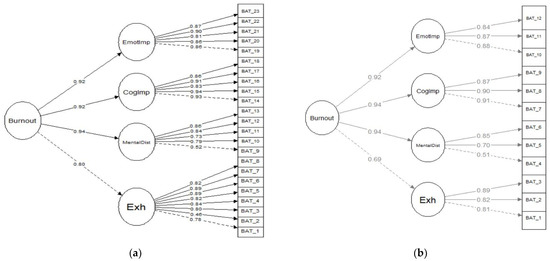 Furthermore, based on the goodness-of-fit indices and its brevity, it is suggested to use the short version of BAT-12 rather than the BAT-23 version. In BAT-12 (Figure 1b), all the dimensions showed a factor loading higher than 0.70 on global burnout. The factorial loading of the items in the specific dimensions of exhaustion (0.81 to 0.89), mental distance (0.51 to 0.85), emotional impairment (0.84 to 0.88) and cognitive impairment (0.87 to 0.91) were all higher than 0.50.