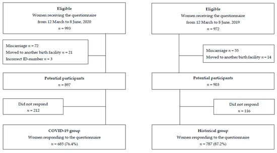 Pregnant women who received a link to the questionnaire from 12 March to 8 June 2020 (n = 993) or in the corresponding period in 2019 (n = 972) were eligible. After excluding women who had a miscarriage, moved to another birth facility, or had an incorrect identification (ID) number, 685/897 (76.4%) women in the COVID-19 group and 787/903 (87.2%) in the Historical group responded (Figure 1). The date 8 June 2020 was set as the end date for the COVID-19 group because from this date, sports facilities, including public swimming pools and fitness and sports centers, were re-opened in Denmark [35]. Women who received a link to the questionnaire on June 8 were included if they responded before 18 June in both 2019 and 2020. Women responding after 18 June in the COVID-19 group (n = 10) and in the Historical group (n = 7) were categorized as non-responders.