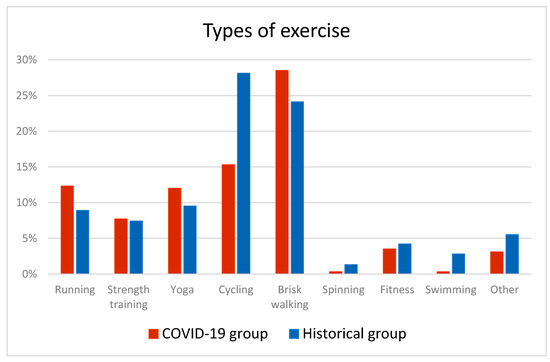 In the COVID-19 group, the five most reported types of exercise were brisk walking (28%), cycling (15%), running (12%), yoga (12%), and strength training (8%). In the Historical group, the five most reported types of exercise were cycling (28%), brisk walking (24%), yoga (10%), running (9%), and strength training (7%) (Figure 2). In the COVID-19 group, only a few women were engaged in swimming (0.3%), spinning (0.3%), and fitness (4%), compared with 3%, 1%, and 4% in the Historical group, respectively (Figure 2). The proportion of women reporting all other types of exercises was 3% in the COVID-19 group and 5% in the Historical group. Engagement in horseback riding and aquatic exercise was low (n = 3) and, therefore, included in the category “other type of exercise” (Figure 2). Differences across groups were significant for cycling (p < 0.0001; FDR < 0.0001) and swimming (p = 0.0002; FDR = 0.0007) only. Differences across groups were significant for cycling (FDR < 0.0001) and swimming (FDR = 0.0002) after correction for multiple testing.