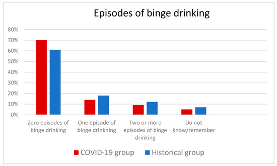 Among the women who reported episodes of binge drinking in the COVID-19 group, 14% reported one episode and 9% reported two or more episodes compared with 18% and 12%, respectively, in the Historical group. The difference across the groups was significant (p = 0.004) (Figure 3).