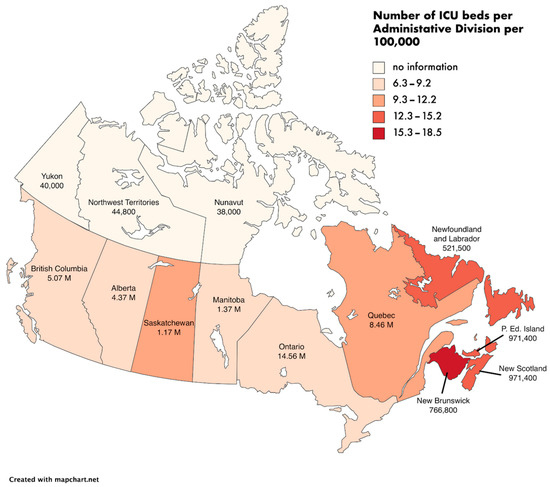 The three territories (Northwest Territories, Nunavut, and Yukon) seemingly had the least number of ICU beds with 5.5 per 100,000 of all Canada [17], and are also the administrative divisions with the smallest population and population densities and with the most difficult access; thus, Nunavut, the biggest administrative division of Canada with more than 2 million km2, has an average population density of only 0.02 people/km2. Even though most of the population is living in the main capital city, not all people can easily access hospitals all year round.