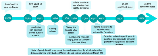 From January 22, the Canadian government recommended to all travelers coming from Wuhan, China to self-isolate for 14 days [40]. A federal-provincial-territorial Special Advisory Committee on the Novel Coronavirus was created to advise Deputy Ministers of Health across Canada on the coordination, public health policy, and technical content related to the COVID-19 outbreak [41].