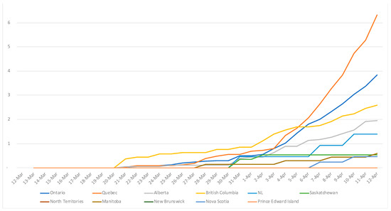 The four most populated provinces of the country accounted for 93% of all confirmed cases in Canada, with ca. 52% in Quebec, 28% in Ontario, 6% in British Columbia and 7% in Alberta. The cumulative number of deaths exponentially increased up to 717 in April 12 (Figure 6); only 2% occurred outside these four most populated provinces [28].