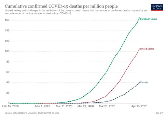 - COVID-19 Data Explorer. Our World in Data. 2021. Available online: https://ourworldindata.org/explorers/coronavirus-data-explorer?zoomToSelection=true&time=earliest..85&pickerSort=asc&pickerMetric=location&Metric=Confirmed+deaths&Interval=Cumulative&Relative+to+Population=true&Align+outbreaks=false&country=USA~CAN~European+Union (accessed on 17 April 2021).