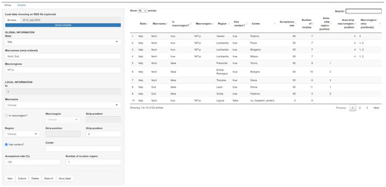 We implemented an R package (https://github.com/UBESP-DCTV/clumpr, accessed on date 2 July 2021) along with a Shiny WEB interface (available at https://r-ubesp.dctv.unipd.it/shiny/clumpr/, accessed on date 2 July 2021) to provide a programmatic infrastructure and a platform to develop and monitor the probability model that reproduces the Italian system of the allocation of organs in “surplus”. The R Shiny app web interface allows the visualization of the results using customizable parameters, as shown in Table 2. Tables S1 and S2 in supplementary report display data about the number of procured/transplanted/discarded lungs in 2015 and 2016.
