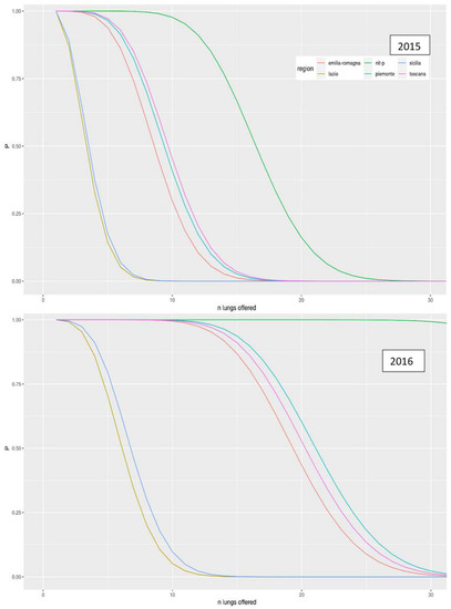Figure 3 and Figure 4 show the trends for the 2015 and 2016 and the probabilities according to the two models as the number of lungs exceeded increases. In both probability models, the Center-North MA seems to be favored. Lazio and Sicily, in the first probability model for both years, always possess a probability of less than 5% and yet another lung is offered to them. The northern regions have far higher probabilities for both years, especially in NITp which maintains a probability higher than 20%. After the second surplus lung, the probability for each region reached a plateau (Figure 2).