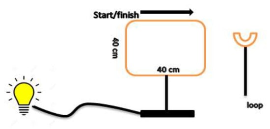 Participants sat in front of a table while grasping a loop with their less-involved (the right) hand to perform a tracking task. The task consisted of a wire square trajectory which had 40 cm for each side, like a wire loop game. The apparatus was sensitive to touch and there was a light bulb that would turn on when the loop touched the wire. In order to complete one trial of the task, participants put the loop on the top and the left corner of the square, and after hearing the “go” signal by the trainer, they moved the loop around the wire square to reach the start place again (Figure 1).