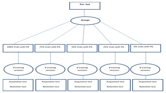 This study was an experimental design with pre-test, acquisition, and retention tests (see Figure 2). In the first session, the participants learned how to perform the task. After demonstration of the skill, a pre-test involving two blocks of 12 trials of the tracking task without any PG was performed by all participants. They were asked to make the movement as accurate as possible (i.e., fewer errors). In the acquisition phase, all participants practiced the tracking task, which consisted of eight sessions every other day (four blocks of 12 trials in each session). The participants had 10 minutes’ rest after each block. PG was implemented by placing the trainer’s hand around the child’s less-involved hand (which was the right hand) and physically guiding it to complete the trial with the least number of errors. At each session, the group with 100% PG received PG in all twelve trials; the group with 75% PG received PG in nine trials (the first three trials out of every four trials); the group with 50% PG received PG in six trials (the first trial out of every two trials); the group with 25% PG received PG in three trials (the first trial out of every four trials); and the no-PG group received no PG (0% PG) in all twelve trials. All practice sessions were conducted in the same manner. An acquisition test was performed in the last session immediately after the trials were completed, and a delayed retention test was performed four days later. The same as the pre-test, the number of total touches (errors) in 24 trials was calculated as the scores of the tests.