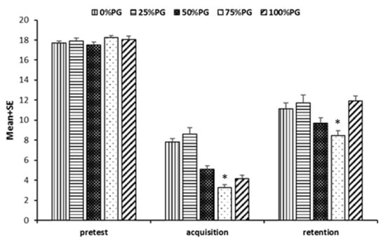 Performance of the groups in the tracking task tests. * Represents a statistically significant difference compared to the 75% PG group with the other groups (i.e., 0%, 25%, and 50% PG groups).