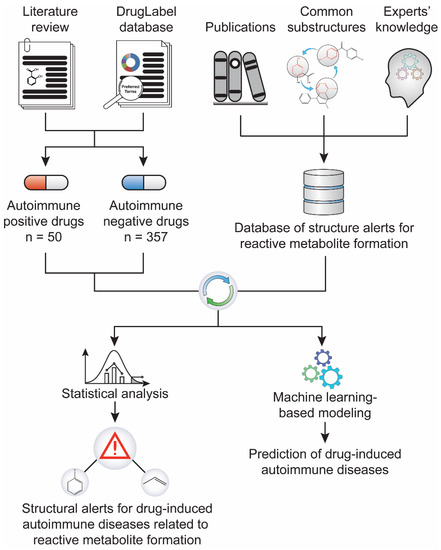 Study workflow. A dataset of 407 drugs, including 50 positives for drug-induced autoimmune disease (AD) and 357 negatives, was compiled through literature text mining and the FDA’s drug label database. In parallel, a library of 171 structural alerts for reactive metabolite formation was collected from literature. The statistical association between the reactive metabolite-related structural alerts and drug-induced ADs was analyzed.