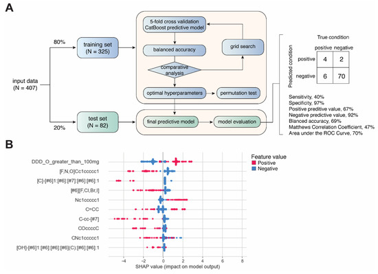 Daily dose was included as a categorical feature by using a cutoff of 100 mg/day. Each drug was labeled as either with a daily dose ≥100 mg or <100 mg. The structural alerts were also used as categorical features. The drugs were labeled as presence of non-presences of a matched structural alert across all the candidate structural alerts in our library. The resulting dataset was stratified and split into training (80%, N = 325) and test (20%, N = 82) sets, which were used to train and evaluate binary classification models generated by CatBoost, respectively [25,26] (Figure 2A). Grid search was performed for hyperparameter tuning. For each set of hyperparameters, 5-fold cross-validation was used for evaluating model performance based on balanced accuracy (i.e., (sensitivity + specificity)/2). Permutation analysis was conducted to determine whether a model performs at chance [27]. Permutated datasets (N = 1000) were generated by randomly reshuffling the classification labels (AD-positive or -negative). The performance of the resulting 1000 models was compared with models from 1000 repetitions of 5-fold cross-validations with different sampling. A two-sided t-test was used determine the statistical significance of the difference between the results obtained from permutated data and original data. Feature importance and contribution were explored using Shapley additive explanations (SHAP) values [28], which quantifies the contribution of each feature to the prediction made by the model (Figure 2B). All analysis was performed using Python programming. The hyperparameters used for the final CatBoost model are listed in Supplemental Table S3.