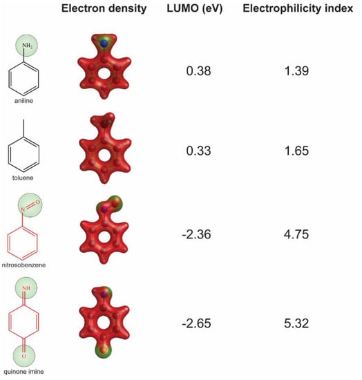 Assessment of reactivity of aniline, nitrosobenzene, quinone imine, and toluene by quantum chemistry analysis. Low electron density areas are shown in green, indicating the potential electrophilicity of the chemicals.