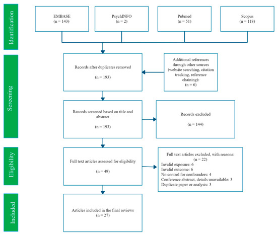 A flowchart of the search and screening process is shown in Figure 1. Our searches identified 193 potentially eligible studies, of which 27 met the inclusion criteria. Study characteristics are summarised in Table 2. Our 27 included studies were conducted in 17 different countries, most (16 studies) used a cross-sectional design and the remainder (11 studies) were prospective. All 27 studies evaluated mercury exposure and birth weight, and approximately half (14 studies) also estimated associations with birth length and head circumference. A variety of mercury measurement methods were used (see Supplementary File Part 5 for details), and the lower limit of mercury detection (LoD) varied considerably from a highly sensitive 0.00004 μg/g MeHg in maternal hair [23] to 2 μg/L Hg in cord blood [24,25]. Full details of each study are reported in Appendix A.