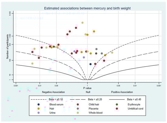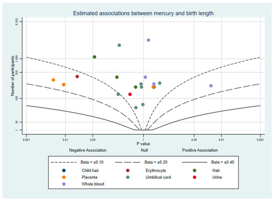 Secondly, we used albatross plots to visually represent study findings, but some studies reported more than one estimate for a single biomarker and birth outcome. These could not be plotted together, and criteria were developed to select one estimate per study. Given the range of differences between studies, these criteria may have led to bias in the plots. For this reason, the plots should be considered a visual aid to the review rather than a complete visual representation of the evidence. A third limitation is that because of the large number of results, we limited this review to only continuous measures of birth outcomes. Binary outcomes such as low birth weight were excluded, and it is possible that the evidence may differ in studies of these. Finally, this review could not assess possible interactions between mercury and other toxicants or nutrients. Toxic metals can have a synergistic effect [63], and micronutrients such as selenium can protect against them [64]. In practice very few studies measure multiple metals, and in those included in this review [31,39] interaction effects were not statistically tested.