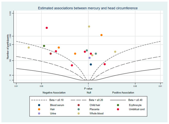 Albatross plot of the estimated effect of mercury exposure on head circumference.