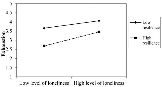 Graphical representations of the significant two-way interactions (see Figure 1 and Figure 2) were made using the standardized regression coefficients of the regression lines for employees high (1 SD above the mean) and low (1 SD below the mean) on resilience. Figure 1 shows that employees with high levels of resilience suffered less from perceived stress under high levels of loneliness compared to employees with low levels of resilience. However, the beneficial effect of resilience on perceived stress was even more marked in a situation of low levels of loneliness. A similar moderator effect was evident for exhaustion, as shown in Figure 2: employees with low levels of resilience reported more exhaustion under high levels of loneliness compared to employees with high levels of resilience. However, it should be noted that resilient employees suffered less from exhaustion, especially in conditions of low loneliness.