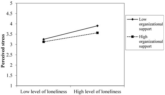 Organizational support, moreover, moderated the loneliness–stress relationship, thus lending partial support to our Hypothesis 8 (see Table 2). Figure 3 shows that the relation between loneliness and perceived stress was more marked for employees experiencing low organizational support. Thus, employees experiencing low organizational support suffered more from perceived stress under high levels of loneliness than did employees reporting high organizational support. However, when loneliness was at a low level, the level of perceived stress was the same for high and low levels of organizational support.