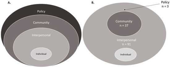 When sorted into the 3-tiered social-ecological model (Figure 1A), 91 examined interpersonal level social environments [22,23,24,25,26,27,28,29,30,31,32,33,34,35,36,37,38,39,40,41,42,43,44,45,46,47,48,49,50,51,52,53,54,55,56,57,58,59,60,61,62,63,64,65,66,67,68,69,70,71,72,73,74,75,76,77,78,79,80,81,82,83,84,85,86,87,88,89,90,91,92,93,94,95,96,97,98,99,100,101,102,103,104,105,106,107,108,109,110,111,112], 37 examined community-level social environments [9,50,68,80,113,114,115,116,117,118,119,120,121,122,123,124,125,126,127,128,129,130,131,132,133,134,135,136,137,138,139,140,141,142,143] and 3 examined policy-level social environments [67,109,110] (Table 2, Figure 1B). Of these, 4 examined both interpersonal and community level environments [50,68,72,80], 2 examined interpersonal and policy level environments [67,109], and 1 examined social environments at all three levels of the social ecological model [110].