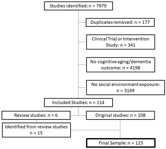 Structured searches identified 7802 non-duplicate studies published from 1968 to 2020. Of these, 133 were included in full-text review and 114—comprised of 108 original studies and 6 systematic reviews—met criteria for data extraction (Table 2 and Table 3). The 6 identified systematic reviews were published between 2004 and 2020 (Table 2). Four of these reviews aggregated studies of one or more dimensions of interpersonal-level social environments, specifically including social network measures, social support, social activity participation and living alone [16,17,18,19]. Two systematic reviews aggregated studies of community-level social environments (neighborhood socioeconomic measures, social disorder/crime and community social support) [20,21]. From the 6 systematic reviews, an additional 15 studies met inclusion criteria, contributing to a final sample of 123 original studies (Table 3). Figure 2 provides the CONSORT flow diagram for the number of identified, excluded, and included studies.