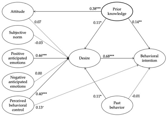 In a similar context, Esposito et al. claimed that MGB could explain a greater variance in physical activity intentions among young adults in comparison to TBP [10]. Their study found that attitudes towards PA, subjective norms and perceived behavioral control were significantly associated with young adults’ desires to participate in PA. Consequently, individuals’ desires were significantly related to intentions towards PA. Similarly, Bavel et al. found that young adults’ desires towards PA were predicted most by attitudes, followed by descriptive norms, perceived behavioral control, and positive anticipated emotions [16]. However, when they were exposed to a positive normative message concerning PA, their desires were mostly predicted by attitudes, followed by positive anticipated emotions, descriptive norms, and negative anticipated emotions. In the context of bicycle touring, Meng and Han found that positive anticipated emotions, subjective norms, perceived behavioral control, the frequency of past behavior, and attitude, in this order, were significantly associated with Chinese bikers’ desires to travel by bike in the near future, while both their desires and the frequency of past behavior were meaningful predictors for their behavioral intentions [17]. For the use of the bicycle for daily travel necessities in a big city, Passafaro et al. found that only positive anticipated emotion and past behavior were statistically significant predictors of bikers’ desires [18].