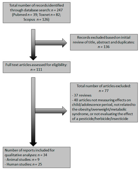 Comprehensive literature searches of Pubmed, Toxnet and Scopus were conducted in April 2021. The filters employed in the database searches were language (English) and date of publication (2005–2021). The search formula was: (“pesticides” OR “herbicides” OR “insecticides”) AND (“obesity” OR “overweight” OR “metabolic syndrome” OR “exercise”) AND (“prenatal” OR “postnatal” OR “long-term effects” OR “child” OR “adolescent” OR “maternal exposure” OR “offspring”). In Pubmed, MeSH terms were employed in the literature search. Furthermore, a manual search was carried out in relevant journals and in the reference lists of reviews focusing on the subject.