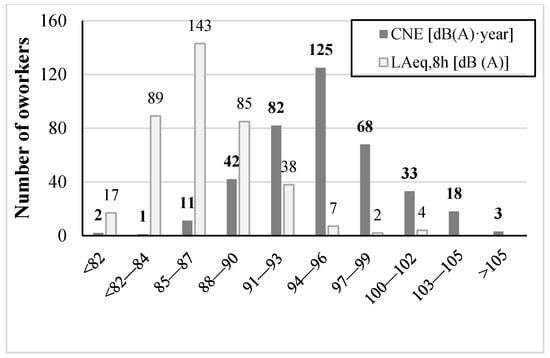 Noise exposure level (LAeq,8h) and cumulative noise exposure (CNE) distribution of the noise-exposed workers. The mean LAeq,8h was 87 dB (A), ranging from 78 to 102 dB (A); CNE ranged from 80 to 111 dB (A)·year with a median level of 95 dB (A)·year.