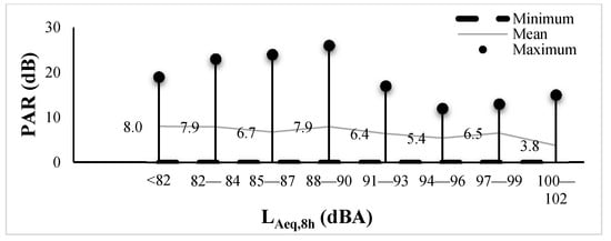 PAR ranges by LAeq,8h group of noise-exposed workers (n = 385). The spot line in this figure represents the mean PAR for each LAeq,8h group. There is no significant difference in the mean PARs among noise-exposed groups.