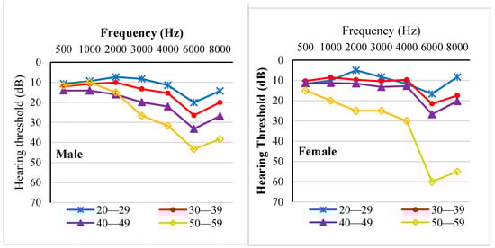 As age increased, so did the hearing thresholds of the noise-exposed workers from the auto parts factory in all tested frequencies (Estimate = 0.526). We observed no significant difference between left and right ears (F = 1.27, p = 0.259). Male workers had worse hearing than female workers (F = 107.84, p < 0.001), except in the 50–59 age group (Figure 4).