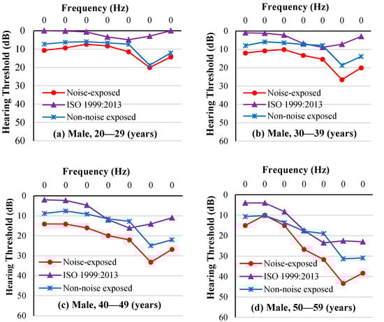 Based on International Organization for Standardization (ISO)1999:2013 (using gender, age, LAeq,8h, and service years), the estimated median high-frequency hearing threshold for each noise-exposed worker was calculated. The comparison of hearing thresholds between noise-exposed workers, non-noise-exposed employees, and ISO-estimated hearing threshold was conducted exclusively within gender by age group. The hearing threshold comparison was conducted by a GLM procedure following HSD test.