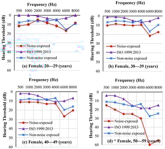 Comparison between the average HTs of noise-exposed female workers, ISO-estimated median HTs of noise-exposed female workers, and the average HTs of non-noise-exposed female workers by frequency and age group. * There was only one female worker in the 50–59 years age group.