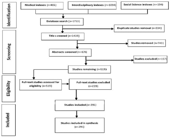 Figure 1 shows the process of identifying relevant articles. The search captured 1753 results in total, which was reduced to 1419 after duplicates were removed. Title scans resulted in a total of 676 articles that were later reviewed by abstract. The abstract review resulted in 519 articles from all the sources. After full-text review, we identified a total of 291 articles.