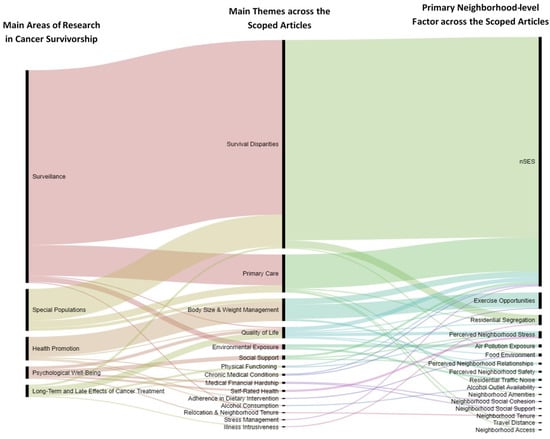 We summarized the results based on the main theme and primary variable in each study. We used an alluvial diagram to show the distributions across different themes and their corresponding variable to highlight broader trends in the current body of literature. We developed a summary chart to classify the main themes. We chose this thematic classification to provide an overview of the neighborhood-level metrics in relation to the main areas of focus in cancer survivorship research.