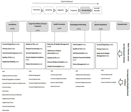 Among the scoped articles, survival disparities, primary care, environmental exposures, quality of life, and residential mobility were the main themes related to surveillance. Neighborhood measures utilized in these articles were: nSES, neighborhood ethnic enclaves [], residential segregation [], access and travel distance [], pharmacy access [], food access [], social and economic polarization [], neighborhood amenities [], neighborhood tenure [], perceived social cohesion [,], and social capital []. nSES was the most common metric and there is abundant literature that shows lower nSES exerts a deleterious effect on cancer outcomes which goes beyond the area supply of specific heath care types []. Most articles relied on nSES quantiles as one of the primary variables to analyze the survival outcomes and utlization of surveillance care and mostly found that survival advantage of living in higher nSES areas was significant [,]. Some studies also found that nSES is independently associated with an increased likelihood of receiving care []. Studies also found that ethnic enclave creates an survival advantage among Hispanic populations in California []. Residential segregation was the second most studied neighborhood metric under surveillance for analyzing survival disparities. Some of these articles found that residential racial composition had a significant negative effect on survival outcomes [,]. Other studies found lower hazards rate for breast cancer survival outcomes for more segregated areas []. One study also showed that access and travel distance to primary care is significantly related to survival outcomes []. Another study found that neighborhood rating based on perceived neighborhood characteristics was associated with access to prescription opioids []. One article showed that social and economic polarization was associated with receipt of a Survivorship Care Plan (SCP) []. Another study found that the odds of neighborhood relocation among cancer survivors were negatively associated with nSES and perceived neighborhood social cohesion []. Studies also suggest that neighborhood social capital in barrios might explain the positive effects on survivorship outcomes among Mexican American women breast cancer survivors [].