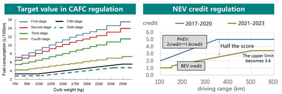 Figure 1. Target value in CAFC (Corporate Average Fuel Consumption) regulation and the NEV New Energy Vehicle) credit regulation. PHEV: plug-in hybrid vehicle; BEV: battery electric vehicle.