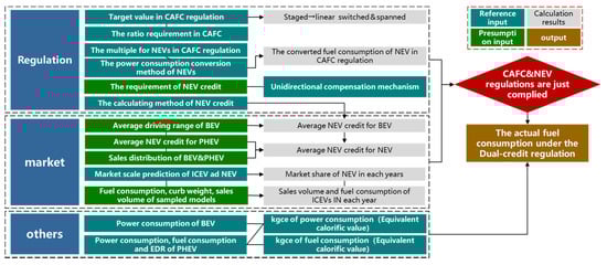 In order to visually quantify the effect of the relaxation, the basic research method is to calculate the NEV credit under different NEV market distributions and then find out the highest average fuel consumption value of the ICEV fleet when the Dual-credit Regulation just complies. Then the difference between this value and the target value in CAFC regulation can quantify the degree of the relaxation. The logic between all relevant parameters is shown in Figure 2. To begin with, the following basic assumptions have been made for the passenger car market: