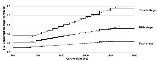 The main parameters of the CAFC integral include the target value of each curb weight segment, the multiple numbers for NEV Wi, and the conversion fuel consumption for NEV FCBEV and FCPHEV. Firstly, fit the step-like curve according to the fourth-stage regulation to a linear curve. Then this curve is Shift down 20%. The average target value is 5 L/100 km in 2020, then decreases down to 4 L/100 km in 2025 and 3.2 L/100 km in 2030 [28]. Then, based on the expected new produced vehicle average weight pivot point (1314 kg, 4 L/100 km), the target value curve is rotated clockwise by 40% (the slope is multiplied by 60%), and then, the fifth stage CAFC regulatory target value is fitted according to each mass segment. The gradient curve, the sixth stage curve, is obtained in the same way, and the target value curve of the fourth, fifth, and sixth stages are shown in Figure 3.