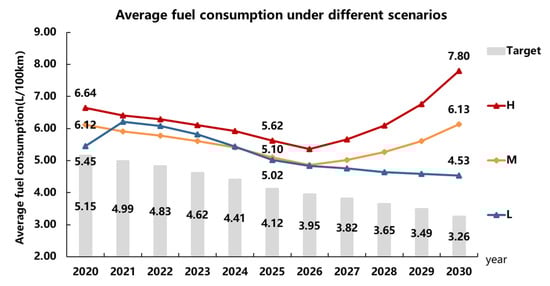 According to the calculations above, in the Dual-credit Regulation, NEV has a greater impact on fuel consumption restriction, and the development speed of the NEV market is positively related to the degree of relaxation. In scenario “L,” the fuel consumption target in 2030 is relaxed from 3.26 L/100 km to 4.53 L/100 km, and the relaxation ratio is about 39.0%, which is relatively low and controllable. However, in scenario “H,” the relaxation is more severe. In 2020, the CAFC target value will be relaxed from 5.15 L/100 km to 6.64 L/100 km, and the relaxation rate is 28.9%, from 4.12 L/100 km to 5.62 L/100 km in 2025, the relaxation rate is 28.2%. Then in 2030, it is relaxed from 3.26 L/ 100 km to 7.80 L/100 km, and the rate is 139.3%. At this time, the actual target value can be even much higher than the target value in 2018. This results in a “tail-lift” phenomenon, which means for companies, the average fuel consumption of their products could be higher than the year before without violating the Dual-credit Regulation. For the scenario “M” in “The Roadmap,” there is also this “tail-lift” phenomenon. Moreover, since scenario “L” represents the lower bond of the NEV sales volume in NEV regulation, the results between 2021–2024 also show that under the new phase of the NEV regulation, the scenario “M” (lower proportion according to “The Roadmap” prediction) [28] might not be able to meet the NEV regulation. There might be a higher pressure on companies to make enough NEVs for compliance.