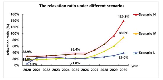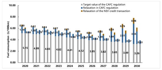 Based on the market and regulation presumptions above, the fuel consumption target and the actual fuel consumption of the fossil-fueled vehicle in each year under three different scenarios are calculated, as shown in Figure 4. In This paper, the actual fuel consumption value stands for the actual target value of fuel consumption because companies can comply as long as the average fuel consumption is lower than this value. The degree of relaxation can be expressed as the difference between the CAFC target value and the actual target value. The ratio of the fuel consumption relaxation for each year is calculated, as shown in Figure 5.