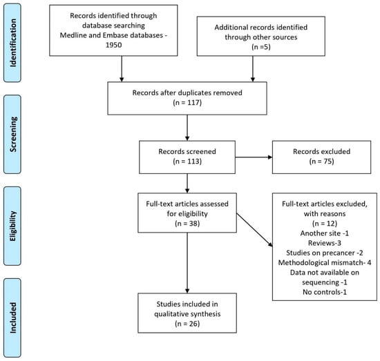 A total of twenty-six articles were included for review; a detailed flow chart of the selection process is provided in Figure 1. The characteristics of the selected studies are described in detail in Table 1. Of the twenty-six studies, ten were from the United States of America [12,13,14,15,16,17,18,19,20,21], four were from China [22,23,24,25], three were from Taiwan [7,26,27], two were from India [28,29], and others were from Yemen [30], Malaysia [31], Australia [32], Japan [33,34], Sri Lanka [35], and New Zealand [36]. The study design for all the studies was cross-sectional, except for one which employed a prospective methodology [19]. The total sample size of the selected studies ranged from 5 to 383, with the number of cases ranging from 3 to 249 and the number of controls ranging from 2 to 242. Collectively, there were 1441 cases and 1368 controls represented in a total of 26 publications. The average age of the subjects ranged from 18 to 81 years. The majority of the studies included both genders as the subjects except two studies which were restricted to male subjects only [12,35]. Other associated factors such as cigarette smoking, betel quid chewing, and alcohol use, HPV, etc., were investigated in fifteen of the selected studies [7,12,20,21,23,24,26,27,28,29,30,31,32,34,35]. The ability to compare or incorporate the results of individual studies was restricted by the extensive differences in various aspects of the studies.