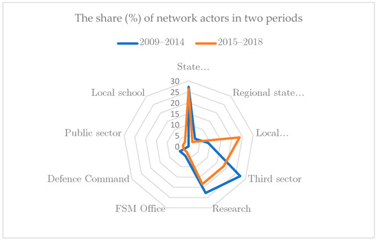 Figure 2). In the first period, the share of local administration representatives was 9%, and in the second period it was 23.7%. Comparably, the share of third-sector actors decreased (27.7% to 18.4%), as did the share of research organizations (22.7% to 18.4%).