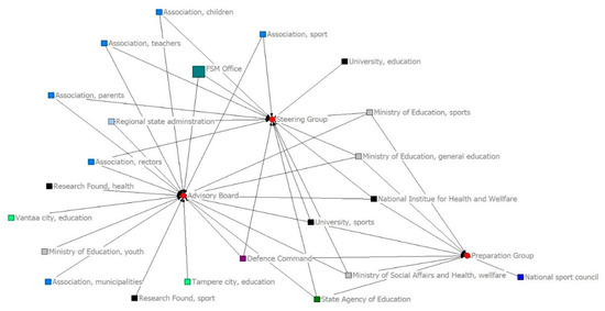 37]. To analyze a social network of this sort, one must usually have data on which actors have participated in which events. In this study, the state’s groups, such as the Steering Group or Advisory Board, were used as events and the organizations who were members of them were the actors. As the actors’ structural properties were analyzed, the focus was on the affiliations, the links constituting the affiliations, and the centrality of the actors. The core idea behind measuring centrality is simple: actors who are more central in social structures are more likely to be influential and powerful; they may extract better bargains and, in the context of this study, have greater opportunities to control the network [