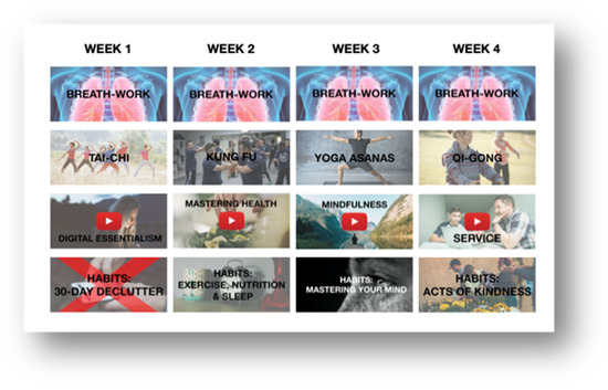 The findings from step 2 were used to generate a full 4-week intervention initial proof-of-concept. Based on the likes, dislikes, criticism, and ideas from participants, a number of activities were combined into a face-to-face intervention delivery. The intervention would consist of four workshops lasting 60–90 min each. It would always start with a deep-breathing exercise, then go into physical activity (e.g., tai chi, yoga asanas, kung fu, and qigong). Then, the workshop would transition to a lecture format and would provide people with lessons on digital minimalism, mastering health, mindfulness, and service. The workshops would all finish with an activity-based component to build new habits around the topic of the workshop (e.g., 30-day digital declutter, habits around exercises, nutrition and sleep, habits to master your mind, and habits to perform acts of kindness).