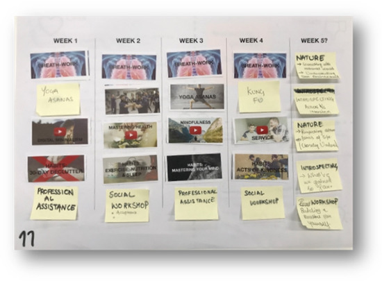 Where step 2 focused on the participant’s experience of and feedback and ideas on activities, step 4 focused on finalising the proof-of-concept design of the overall intervention in terms of structure, length, delivery, and price. During the sessions in step 4, participants were first asked to complete a questionnaire. After completing the questionnaire, the participants were guided through a 7–10 min breathing exercise similar to those in step 2. Following the breathing exercise, the facilitator presented multiple activities that could be part of the intervention. These activities included the most popular activities identified in step 2 and additional suggestions given in those sessions. For an overview of the PD session activities, please refer to Table 3. Then, participants were asked to individually complete the feedback capture grid. After completing the feedback capture grid, the participants were asked to individually design their own programs (see Figure 4). In this step, 27 unique programs were designed (see Figure 5 for an example).