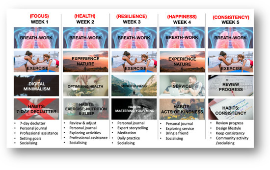 The findings from the previous steps were used to alter the proof-of-concept to a 5-week eHealth well-being intervention. The final components of the intervention would be delivered through an eLearning portal. Accommodating the needs of the participants, each week of the program would entail 90–120 min of digital content (video lessons, quizzes, and worksheets) to deliver the program components. A fifth week was added, which would focus on reviewing progress and preparing to keep consistency moving forward. More specifically, the 30-day digital declutter would be reduced to 7 days; participants would receive a personal journal; and attention would be focused on setting goals, building habits (e.g., exercise, sleep, mindfulness, meditation, voluntary service, and acts of kindness), reviewing progress, and keeping consistency. Other aspects such as a self-assessment, socialising, professional assistance, and lifestyle design, would be included. In addition, a virtual community would be developed to enable online community engagement and provide further resources to help people to continue to improve their well-being. A visual design of the final proof-of-concept can be seen in Figure 6.