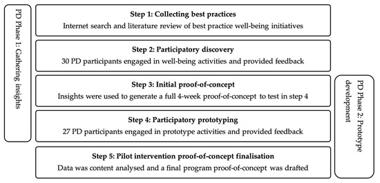 In conclusion, while four phases of PD are identified (insights, prototype, implement, evaluate), a clear, sequential process to use PD to design eHealth interventions does not exist. Therefore, the objective of this paper is to define a stepwise process to design eHealth interventions using PD. Specifically, this paper provides a five-step process to sequentially design a well-being intervention through the PD phases of gathering insights and proof-of-concept development. The followed PD process leverages the existing three-step PD process [41], yet proposes a more tailored approach to design eHealth interventions to ensure they are cocreated.