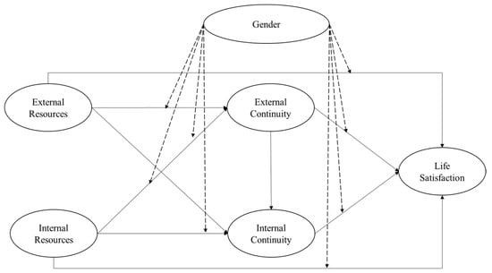 The gender differences in the main variables were examined by independent t tests (please see Supplementary Table S1). The analysis gives a microscopic view of how the results might differ based on gender. Overall, the findings showed that older men and older women did not show significant differences in external resources, external continuity, internal continuity, or life satisfaction with the exception of internal resources. In particular, older men showed higher internal resources than older women. The correlation coefficients among the measured variables are reported in Table S2. All main constructs (external continuity, internal continuity, and external resources) were positively correlated to life satisfaction. The quartiles of the variables are shown in Table S3.