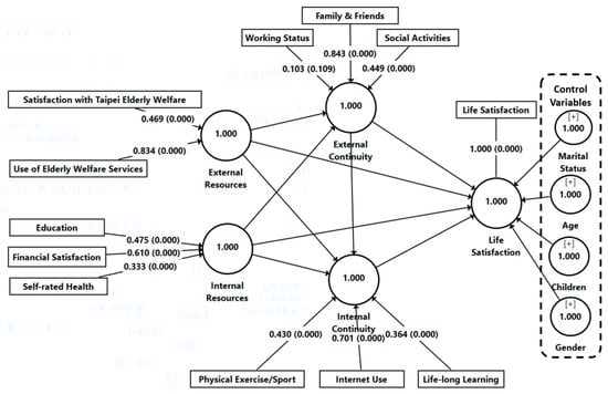 We examined the measurement model based on the properties of the formative construct, a multicollinearity assessment among items and the significance of the items’ weights []. The variance inflation factors (VIFs) were used as the metric to evaluate multicollinearity. As Table 3 shows, multicollinearity issues were nonexistent among all four constructs as the VIF values were below 3.0, ranging from 1.006 to 1.142 []. The significance of the formative items was examined using the bootstrapping technique []. The findings showed that both items (use of elderly welfare services = 0.834 and satisfaction with Taipei elderly welfare = 0.469) had pronounced significant effects on external resources (p < 0.001). Regarding internal resources, three items (financial satisfaction = 0.610, education = 0.475, and self-rated health = 0.333) were statistically significant with p < 0.001. Two out of three items of external continuity (social activities = 0.449 and family and friends = 0.843), but not working status, were significant (p < 0.001). Nonetheless, this item was retained to fully capture the domains of external continuity, supported by the explanation in continuity theory []. Furthermore, internal continuity was found to be significantly (p < 0.001) explained by three items, namely, life-long learning (0.364), physical exercise or sport (0.430), and Internet use (0.701) (see Table 3 and Figure 2).