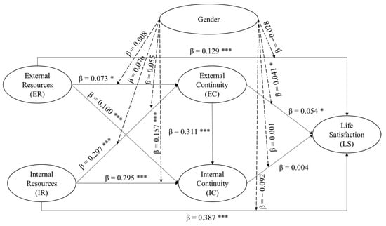 The results of the estimated parameters of path coefficients are shown in Table 4 and Figure 3. External resources (β = 0.129, t = 3.780) and internal resources (β = 0.387, t = 11.213) positively predicted life satisfaction. The results further reported that external resources (β = 0.073, t = 2.761; β = 0.100, t = 3.178) and internal resources (β = 0.297, t = 10.414; β = 0.295, t = 10.520) positively influence external continuity and internal continuity. External continuity indeed promotes internal continuity (β = 0.311, t = 12.814) and life satisfaction (β = 0.054, t = 1.942). However, internal continuity did not significantly influence life satisfaction. We controlled for gender, marital status, age, and children as these variables have been consistently reported to affect life satisfaction [,]. In this study, there were no significant effects of marital status, children and gender on life satisfaction. It can be concluded that these factors have negligible impacts on life satisfaction. Nevertheless, a significant relationship was found between age and life satisfaction.