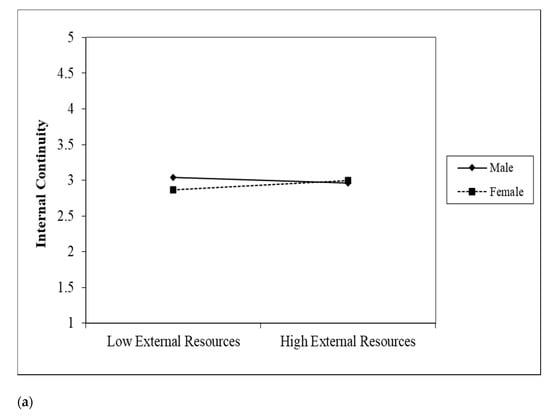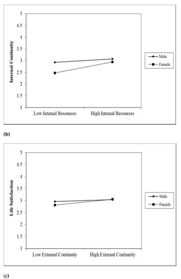 These significant relationships were further explained using an interaction plot recommended by Dawson []. Figure 4a–c show that the slopes for older women (dotted line) are steeper than those for older men in all three plots, indicating that the positive impact of internal resources and external resources in driving continuities and life satisfaction are stronger for older women than for older men. A closer investigation using model comparison approach (see Table 7) for older men and older women indeed indicated that older women demonstrated higher path coefficients in all three relationships. In fact, external continuity’s influence on life satisfaction was not significant for older men.