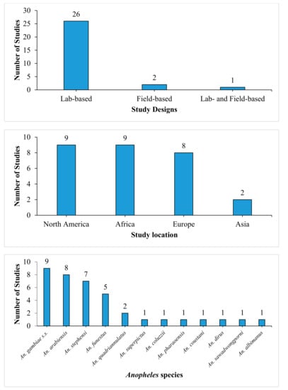 | Oliver and Brooke [29] | Laboratory-based | South Africa | An. arabiensis | 25, 30, and 35 °C RH 80% ± 5% |